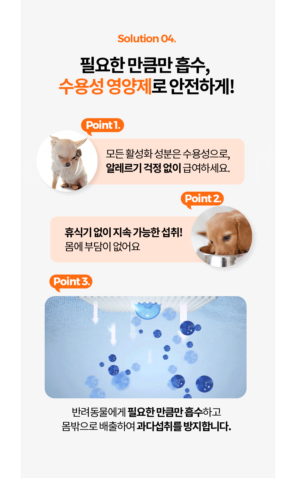 - 물 섭취 확인: 영양제 복용 전후에 충분한 물을 마시게 해 소화와 흡수를 돕도록 합니다.