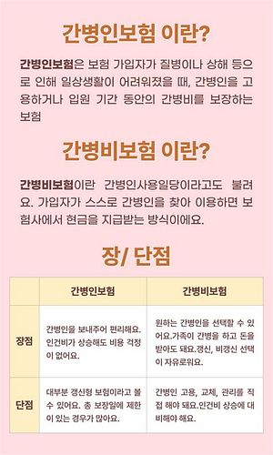 - 간병인보험(지원일당형): 보험사가 간병인을 직접 파견해주는 방식.