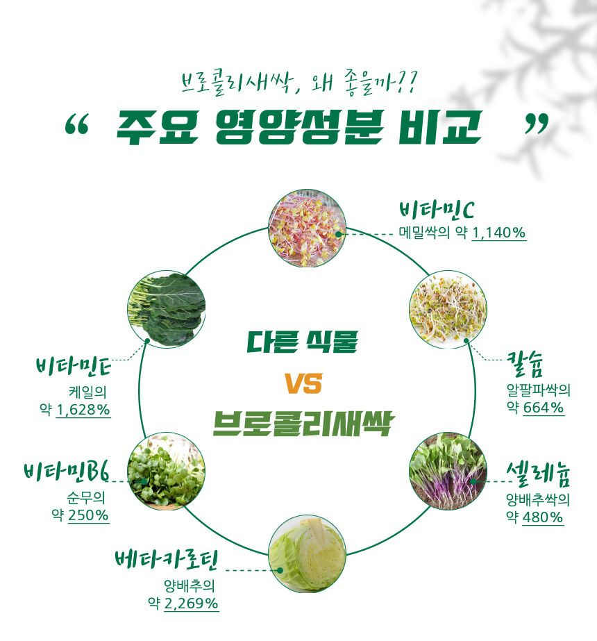 - 글루코시놀레이트(Glucosinolate), 이소티오시아네이트(Isothiocyanate) 등 황화합물은 두 식재료 모두에 풍부히 포함되어 있지만, 새싹의 항산화 활성과 생리활성이 더 뛰어난 것으로 최신 논문에서 확인되었습니다.