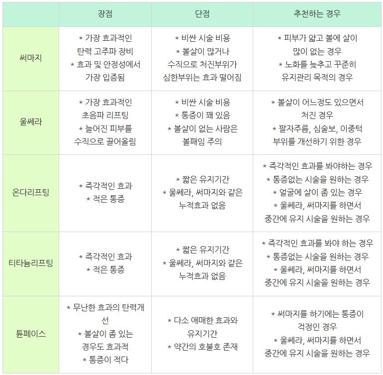 - 울쎄라 추천: 피부 처짐이 많거나 얼굴 라인(턱선 등) 리프팅 효과를 원할 때.