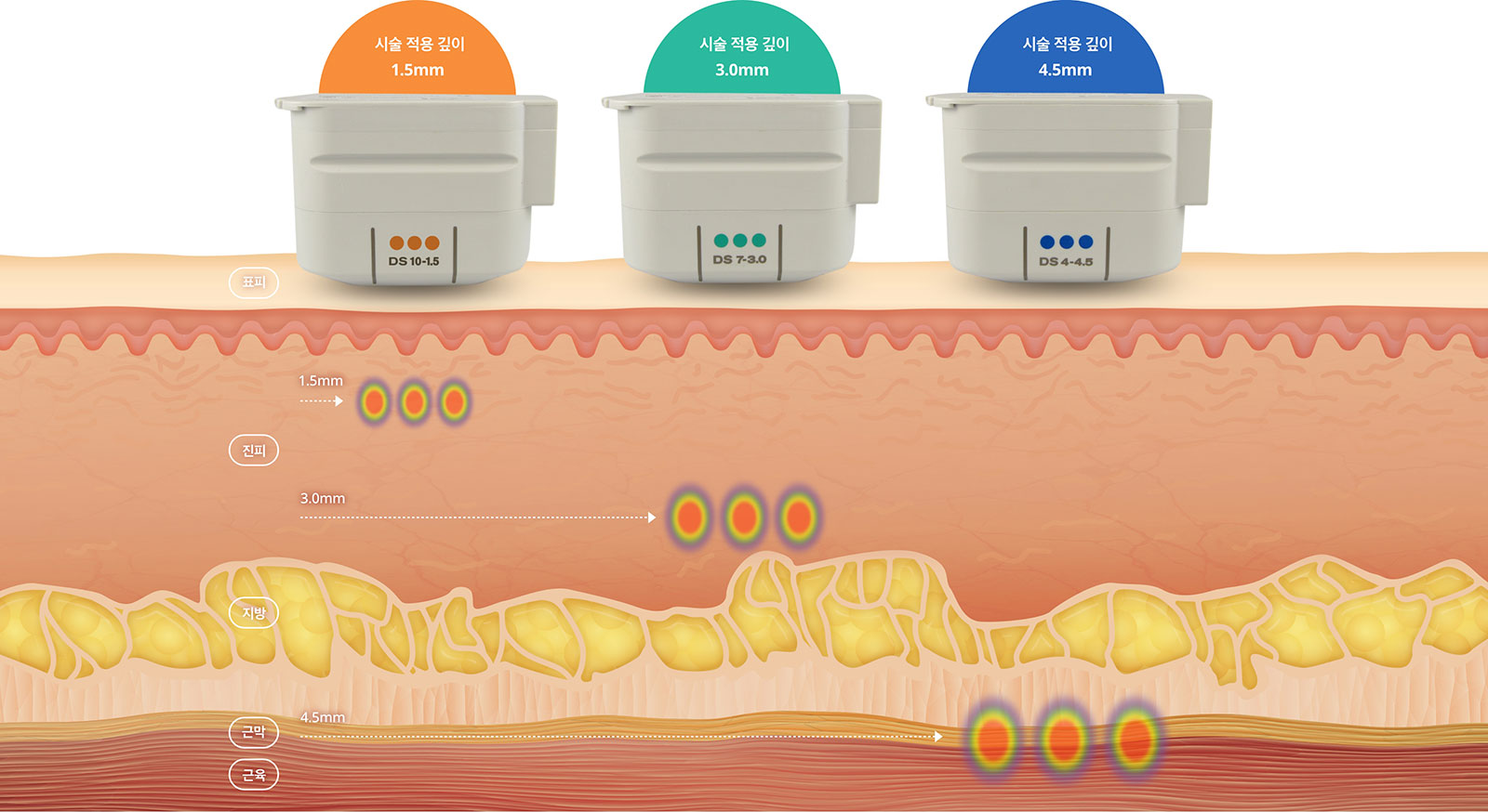 - 고주파(RF) 에너지로 피부 진피층과 표피층을 자극해 콜라겐을 생성하고 재생을 촉진합니다.