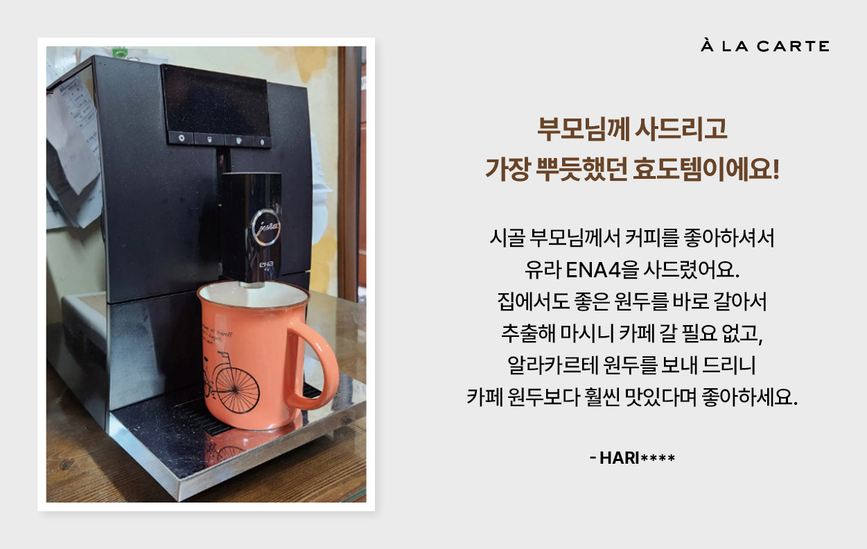 | 유라 ENA4 | - 프로페셔널 아로마 그라인더 - 3D 추출 기술, 3단계 농도 조절 - 자동 세척, 정수 시스템 - 블랙커피에 최적화 |